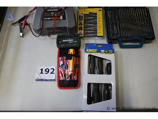 Acculader - accugor - matic 8 set schroevendraaiers - hikoki - diverse maten set schroefbits (7-delig) - irwin - diverse maten set tangen (6-delig) - kinzo - diverse maten boor- en bitset - diverse maten