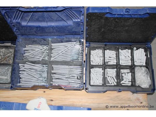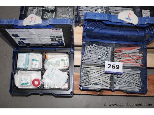 Doos met schroeven - berner - diverse maten doos met pluggen - berner - diverse maten doos met bevestigingsmateriaal - berner - diverse maten doos met pleisters en verband - berner - diverse maten