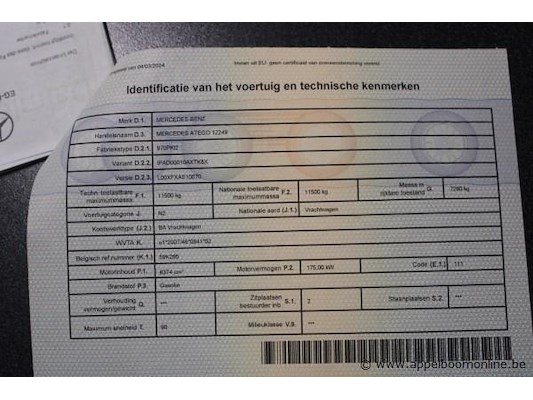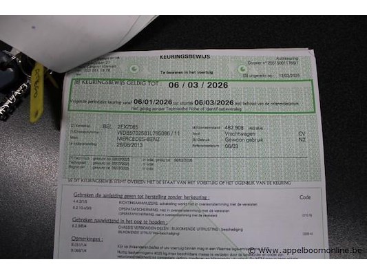 Vrachtwagen mercedes, atego, wdb9702581l785086, 1e insch 26/08/2013, 6374cm³, 175kw, diesel, 507832km, keuring geldig tot 06/03/2026, kentekenbewijs deel i, identificatieverslag, gelijkvormigheidsattest