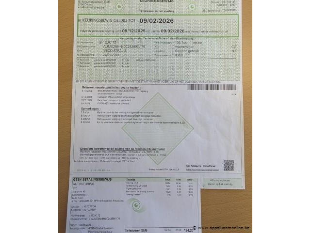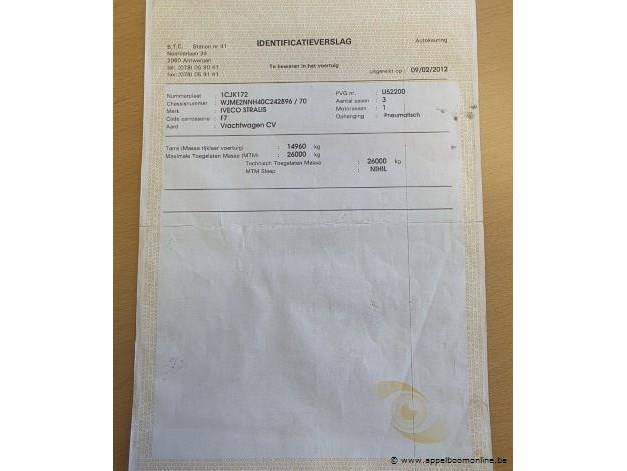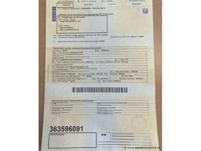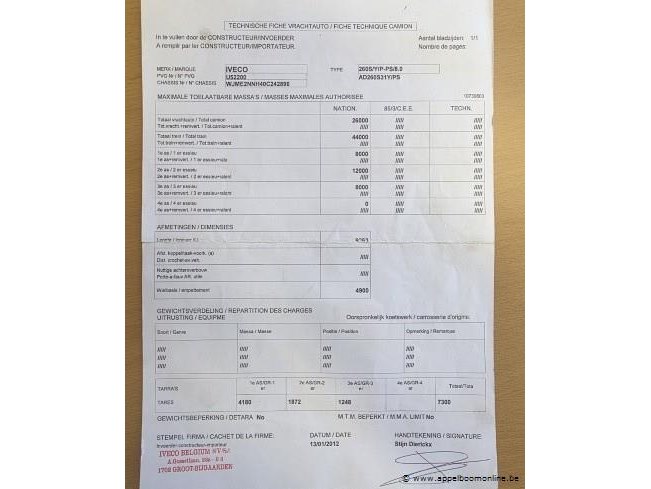 Vuilniswagen iveco ad260s31, datum 1ste inschrijving 24/1/2012, chassisnummer wjme2nnh40c242896, km-stabd laatste keuring 109.745, euro eev