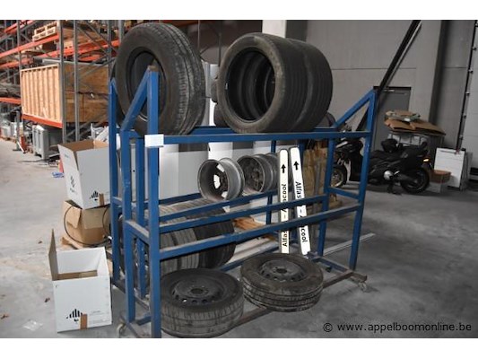 Verrijdbaar bandenrek, wo. diverse autobanden, velgen en wielen