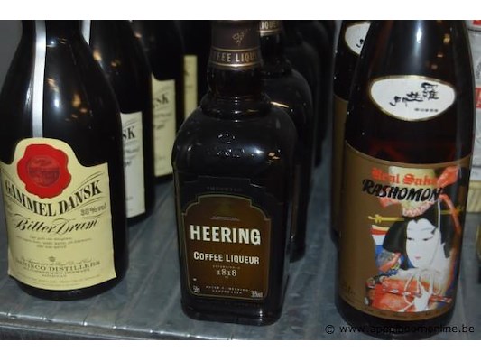 17x fles diverse alcoholische dranken, o.a. gammel dansk bitter dram, heering coffee liqueur, rashomon sake, stock, frangelico, 70cl/720ml