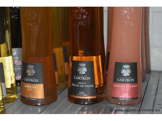 20x fles likeur, joseph cartron, wo. sureau (amber), mangue (amber), crème de pêche de vigne (amber), pamplemousse rose (roze), cassis (donker), vermouth blanc (helder), 70cl