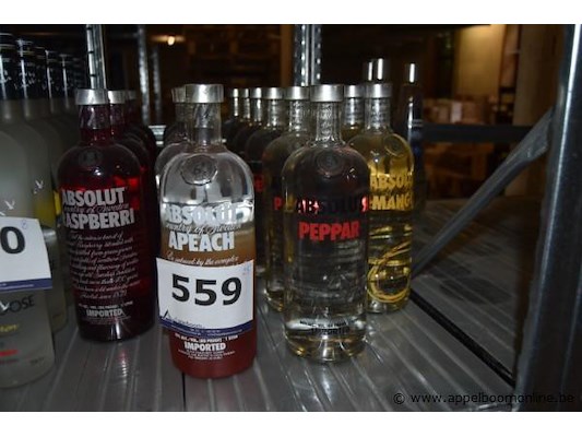 25x fles vodka, absolut, wo. raspberry, apeach, peppar, mango, 1l, 40% alc.