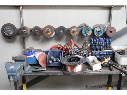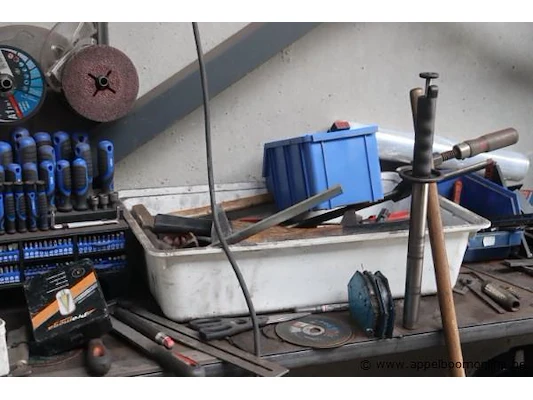 Stalen werktafel met inhoud wo gereedschappen, boren enz