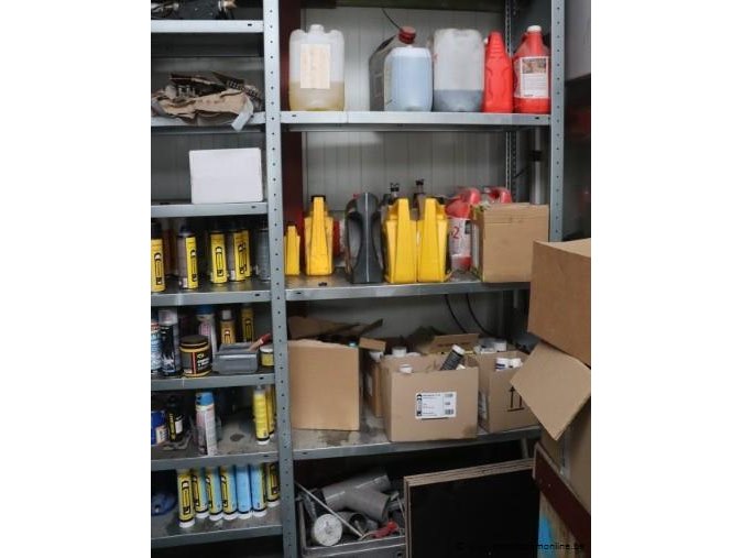 Stalen stelling inhoudende diverse wo onderhoudsproducten, olie, elektramateriaal enz
