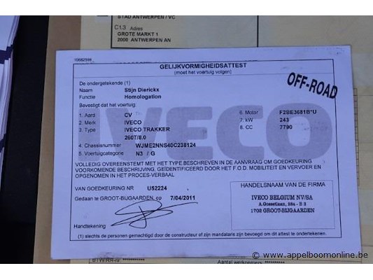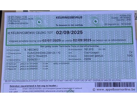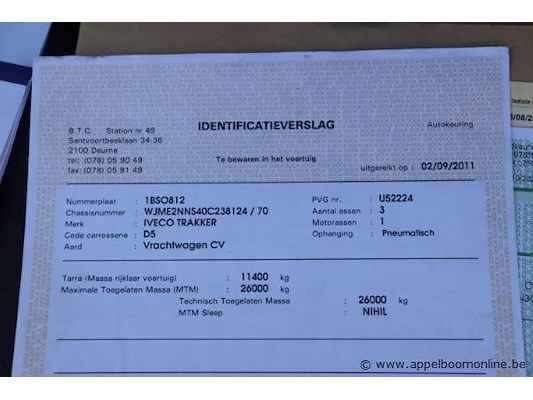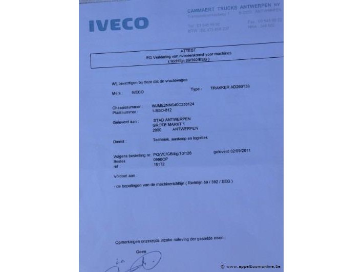 Containervrachtwagen iveco trakker ad260t/8.0, datum 1ste inschrijving 23/8/2011, chassisnummer wjme2nncs40c238124, km-stand keuring 10/24 161.910, euro 5, diesel, kenteken, gelijkvormigheidssattest