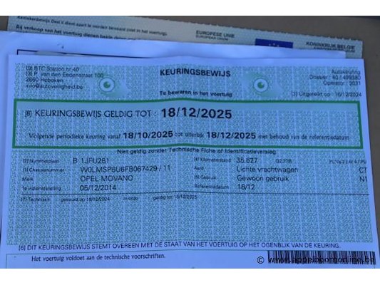 Lichte vrachtwagen opel movano, datum 1ste inschrijving 5/12/2014, chassisnummer w0lmsp6u6fb067429, dubbel cabine, km-stand keuring op 12/24 35,627, euro 5b, diesel, co2 248, kenteken i+ii, gelijkvormigheidssattest