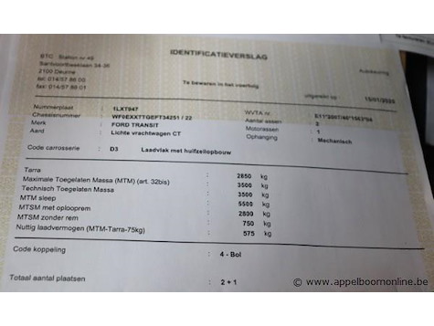 Lichte vrachtwagen ford transit, datum 1ste inschrijving 29/12/2014, chassisnummer wf0exxttgeft34251, 36725km, euro 5, diesel, kipper, co2 212, kenteken i+ii, gelijkvormigheidssattest