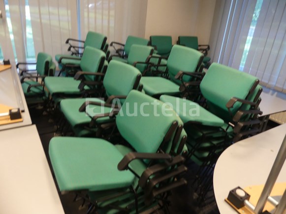 Conferentie stoel Merk: Giroflex Artikelnummer: 47611 Lengte: 63 cm Breedte: 54 cm Hoogte: 82 cm Hoeveelheid: +/-15 Zwart stalen frame Zitting in groen geruite stof 2 armleuningen Zithoogte: 48 cm