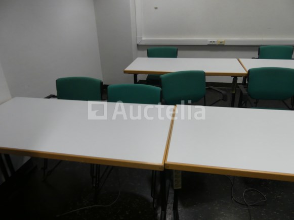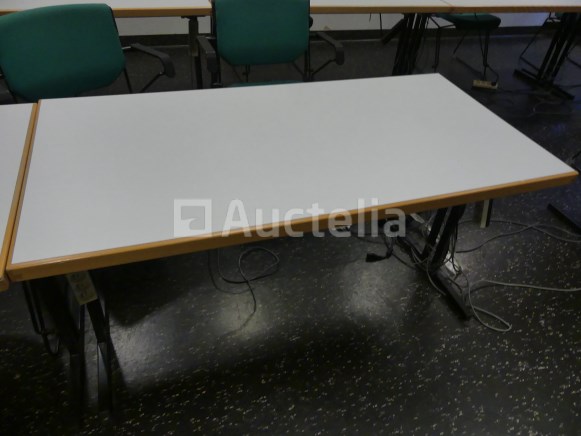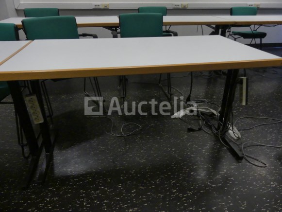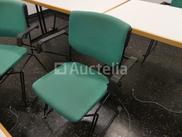 +/-10 x rechthoekige tafels 140x70x74 cm, houten plank, inklapbare poten +/-12 x Giroflex stoelen met armleuningen, zwart stalen frame, groen geruite stoffen zitting
