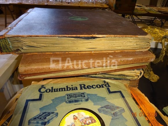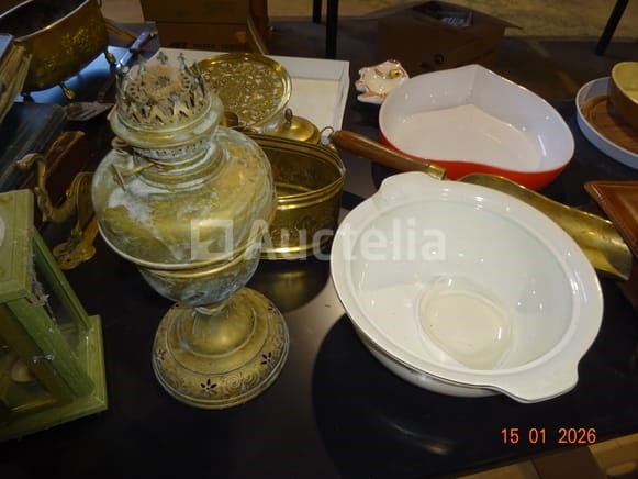 De inhoud van de brug waarvan 1 set 33 toerenplaten Koperen plantenpotten Koperen quinquetlamp Oude koffer borden enzovoort...