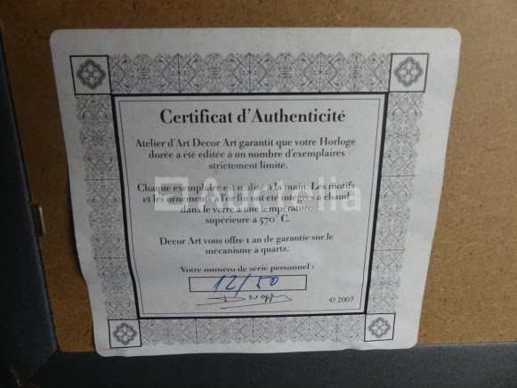 Frame met klok Breedte: 31 cm Hoogte: 57 cm Hoeveelheid: +/- 3 Met een certificaat van echtheid op de achterkant van het frame In hun originele verpakking Notities: Ophalen op afspraak