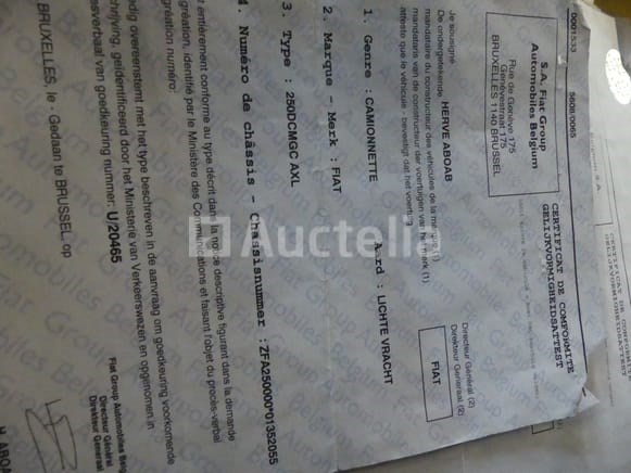 Dubbelcabine flatbed bestelwagen Merk: Fiat Model: ducato Jaar: 2008 Kilometerstand: 342332 Vermogen: 88 watt Datum van 1e inschrijving: 11-01-08 Brandstof: Diesel Verplaatsing (cc): 2267 Versnellingsbak: Handgeschakeld Radio: Ja Aantal toetsen: 1 Zitcapaciteit: 7 Certificaat van conformiteit: Ja Technisch keuringscertificaat: Ja Technisch keuringscertificaat geldig tot: 06-02-25 Registratiecertificaat Deel 1: Ja Registratiebewijs Deel 2: Ja Voertuig nog in gebruik (kilometerstand verandert): Ja Chassisnummer: ZFA25000001352055 Eurostandaard: 4 Staat: Te renoveren Het voertuig startte tijdens de inventarisatie Rollen op Pickup Geleverd zonder kenteken Opmerkingen: Het voertuig is tijdens de inventarisatie niet grondig geïnspecteerd en kan niet-zichtbare gebreken vertonen De koper moet het perceel vóór de laatste veiling hebben bezocht om eventuele afhandeling of logistiek te plannen die nodig zijn voor het innen van zijn aankoop
