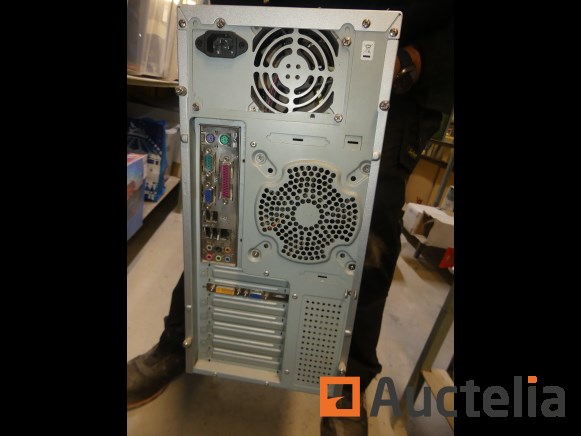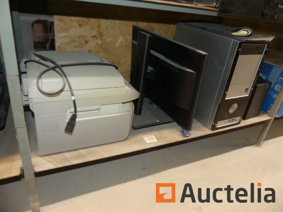 Apparatuur van bureautafel; pc-toren, scherm, toetsenbord, muis, printer