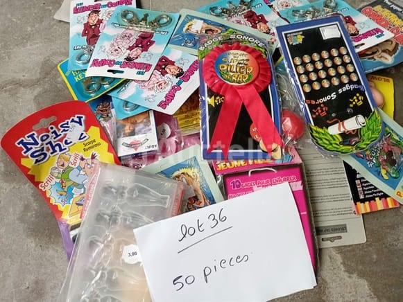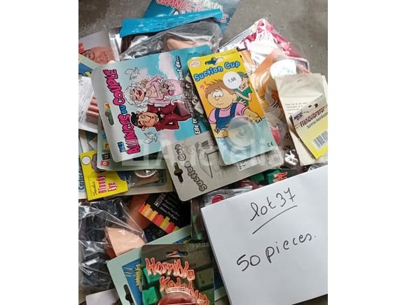 Set van +/-7 dozen plastic handschoenen 100 stuks - nieuw (dus in totaal 700 handschoenen) Set van +/-12 geesten om op te hangen met Halloween of andere - Nieuw 1 grote ronde lamp Set van +/- 50 pakketten diverse humoristische artikelen - nieuw Set van +/- 50 pakketten diverse humoristische artikelen - nieuw
