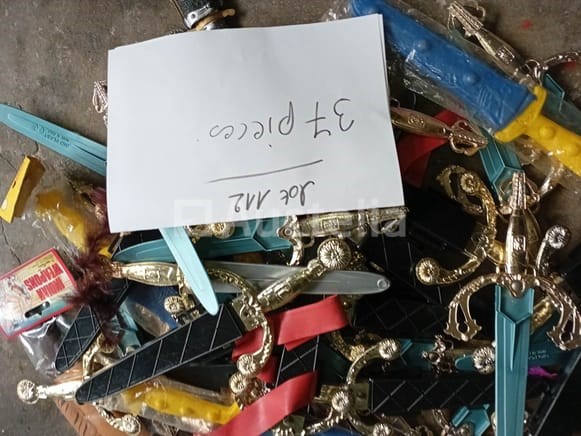 Set van 17 egyptische carnavalsborstplaten - nieuw set van 8 egyptische carnavalsaccessoires - nieuw set van 37 messen zwaarden speelgoed diverse kinderen - nieuw set van 11 sets verschillende kermisaccessoires - nieuw set van 34 pakketten met diverse kermisartikelen - nieuw set van 10 diverse carnavalsitems - nieuw