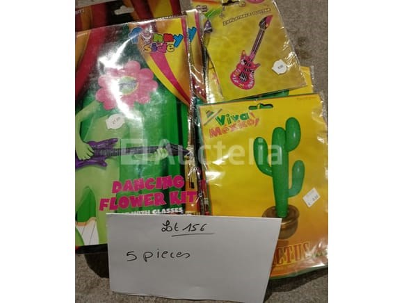Pakje +/-43 pakketten fluorescerende hoofdbanden en armbanden in verschillende kleuren Pak +/-3 neon jurken - Nieuw Pak van +/- 11 paar kniekousen - nieuwe verschillende kleuren Pakje van +/- 5 pakjes opblaasbare decoratieve items - nieuw