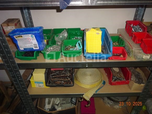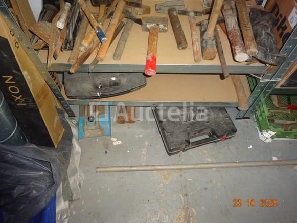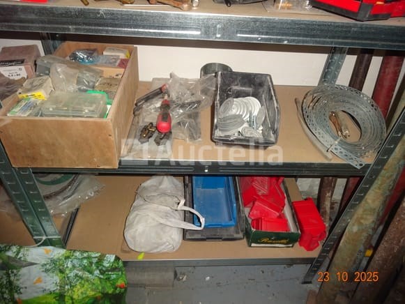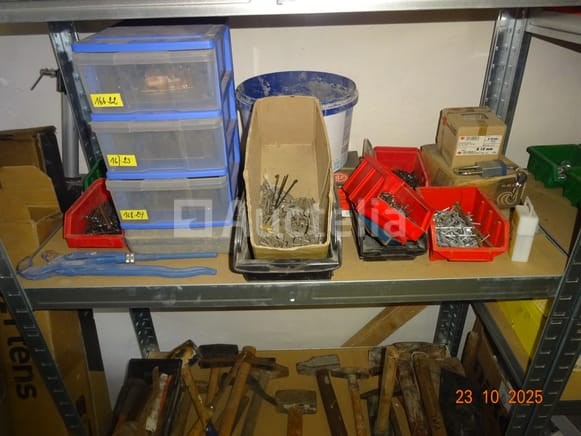 De inhoud van een plank over een lengte van +/- 2m70 bij 1m75 hoog, namelijk: hamers, spijkerdozen, gatzagen, bits, bouten, banden, plastic rollers, timmermansschaar, schroevendraaier, ring, 2 x 2 metalen ladedozen