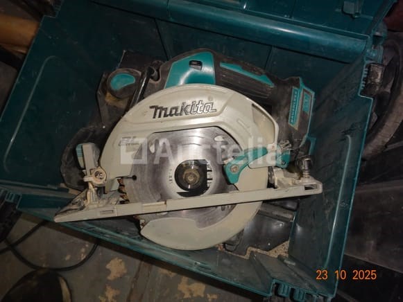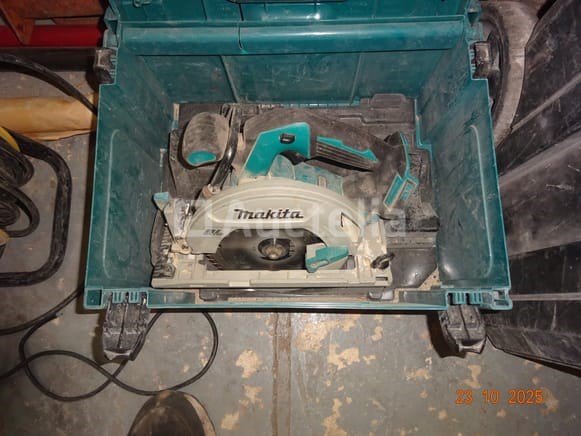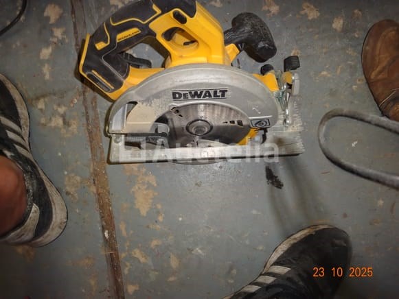 1 DEWALT Cirkelzaag 1 DEWALT-legpuzzel 1 zwarte plastic doos 1 PVC-doos met MAKITA cirkelzaag 1 elektrisch verlengsnoer met 4 stopcontacten op een gele spoel