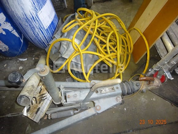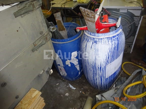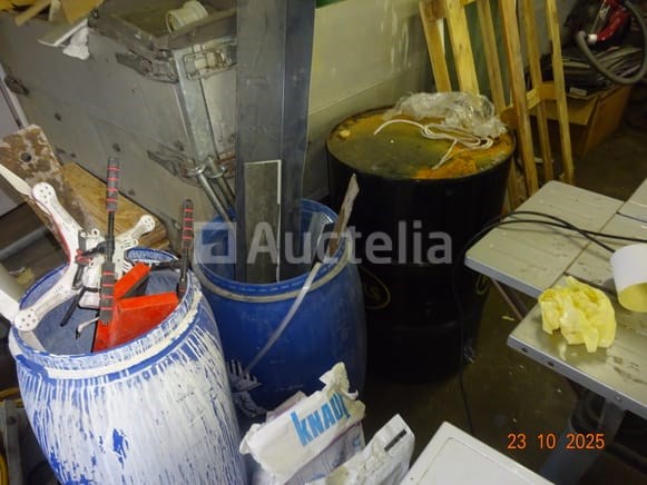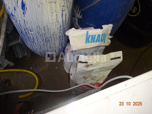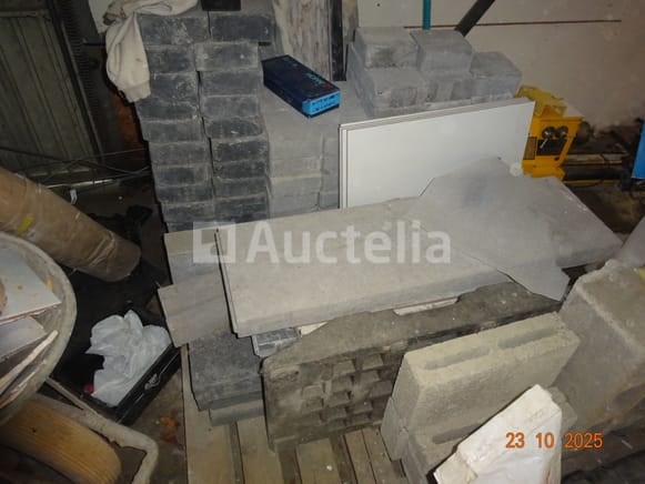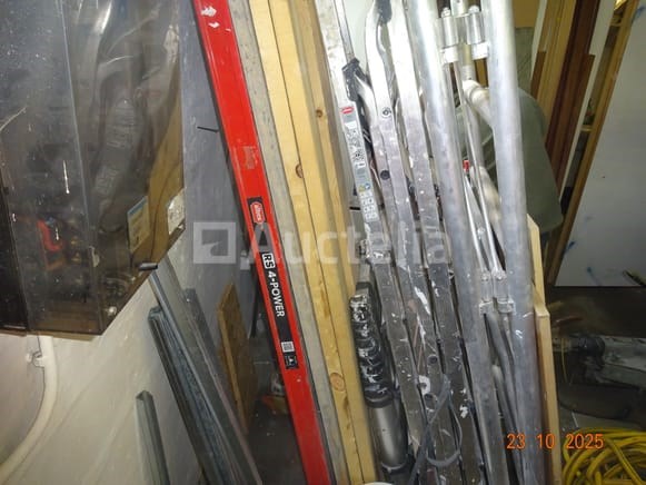 1 aluminium steiger 2 ALTREX merk trapladders 1 opvouwbare ladder 1 set balken 1 binnensteiger, zwart 1 STHIL snoertrimmer 2 PVC-brugen 1 witte kast 1 set hout rechts van de witte kast De inhoud van de sanitaire ruimte, waaronder de brugbrug, diverse containers 1 gele tuinslang 1 OLCIM-tas 1 FIX-zak 2 blauwe PVC-containers en inhoud, 1 lege zwarte metalen container 1 stofzuiger van merk ROWENTA 1 pallet inclusief een set klinkers, blokken, randtegels, Tegels