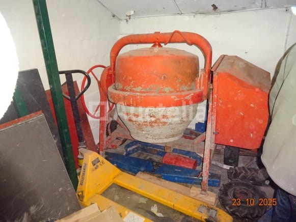 1 grote oranje aangedreven betonmolen op wielen