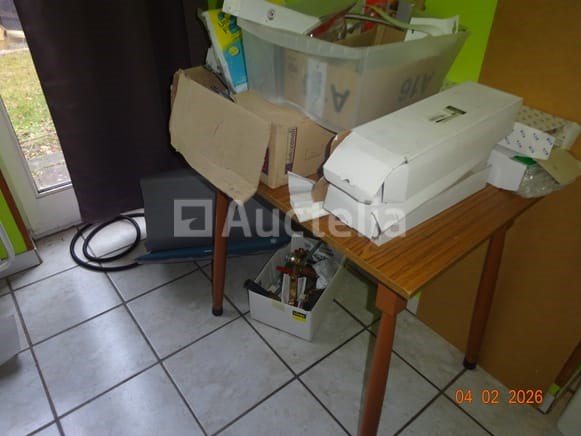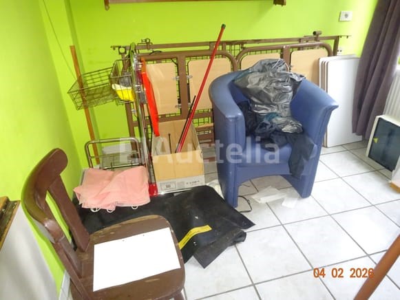 Eenwielige trolley 1 nachtkastje 1 blauwe fauteuil 1 stoel 1 tabel 1 elektrische laadbak 90/200 op wielen, opgevouwen 1 elektriciteitskast 1 kast met twee deuren en één lade 1 stoel 3 versieringen, waaronder 1 teaser, 1 plant, 1 kleine fontein 2 kisten met boeken De hele kamer moet worden leeggehaald