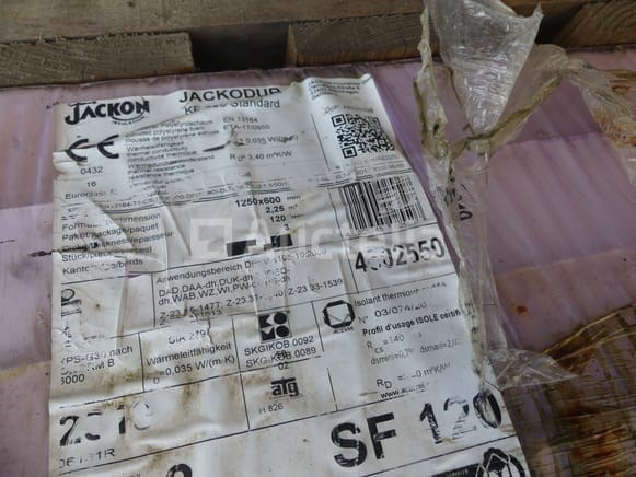 Isolatiepanelen van 12 cm dik Merk: Jackon Model: Jackodur Lengte: 125 cm Breedte: 60 cm Hoogte: 12 cm Hoeveelheid: +- 24 Verspreid over 1 pallet