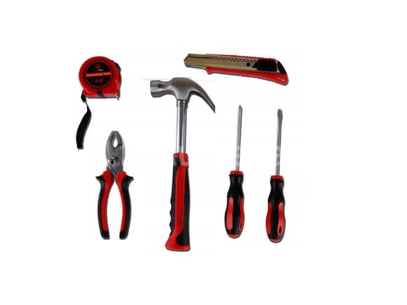 Details: . Hamer . 3m Meetlint . Flathead Schroevendraaier . Kruisschroevendraaier . Klem . Bindmesje (met gebroken lemmet)