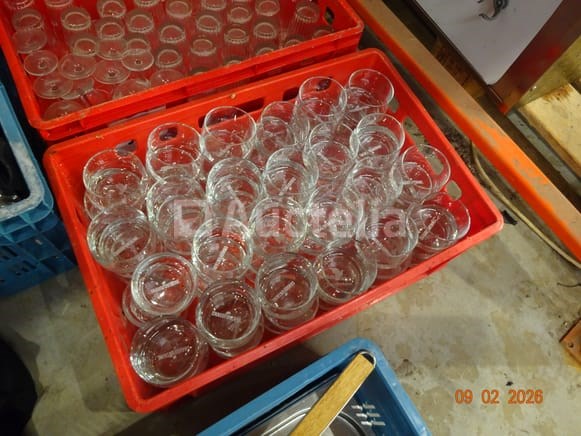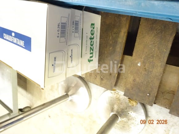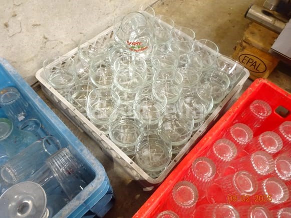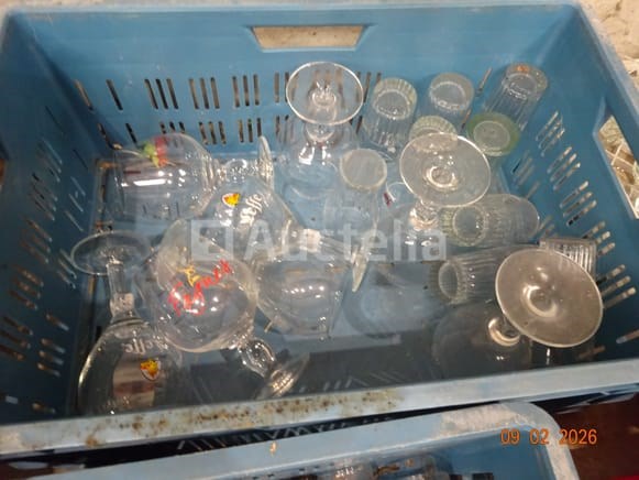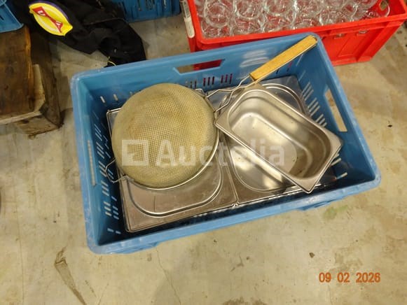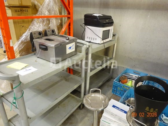 2 PVC-trolleys 1 magnetron 1 drukker 1 dubbele frituur Merk: FRITEL De inhoud van 10 rode of blauwe PVC-bakken (bodems maken geen deel uit van de verkoop) waaronder: glazen in Chaudfontaine Bierglazen brillen in Leffe Fens bierglazen Waterglazen Wijnglazen 2 roestvrijstalen emmerhouders