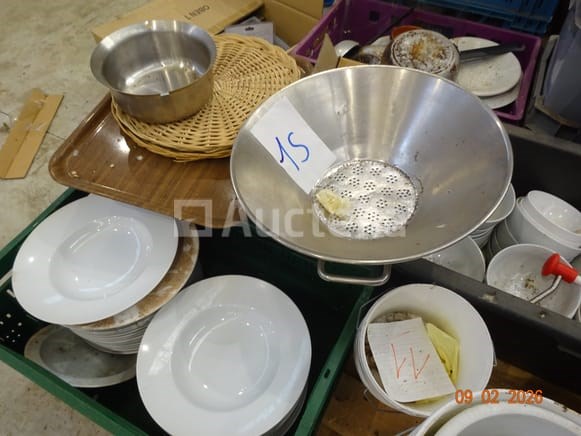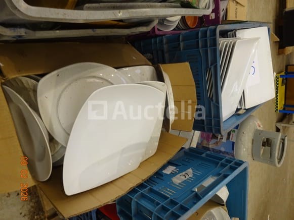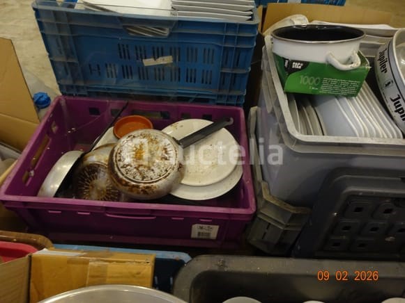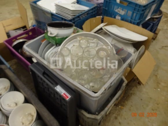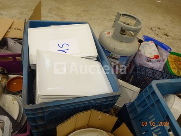 De inhoud van twee pallets (d.w.z. de bakken maken geen deel uit van de verkoop) waaronder: 1 grote voorraad platen Gascilinder Vierkante platen Rechthoekige platen Bekers en schoteltjes Lenzen Stekelpannen
