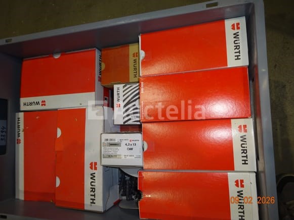 De inhoud van vier PVC-bakken (bakken die niet deel uitmaken van de verkoop) waaronder: Bouten Schroeven WURTH PVC-accessoires 1 Rood Kabinet Grootte: 1m20/35/2m50