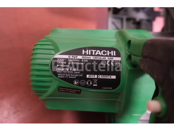 Draagbare cirkelzaag Merk: Hitachi Model: C 7UY Jaar: 2015 Spanning: 230V Mono Vermogen: 1300 watt Conditie: Niet getest In de opslagkist