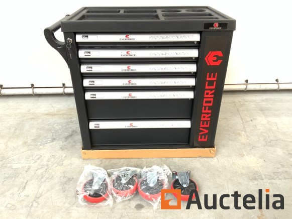 4 laden gevuld; verrijdbaar; afsluitbaar; lade 1 Doppenset 1/2” en 1/4” 4 tot en met 32 en toebehoren; Lade 2 steek ringsleutelset 8 tot en met 22 torx imbusset bitjes; lade 3 schroevendraaiers en imbusset; lade 4 tangen, hamer, pendrijvers; lade 4 & 5 zijn leeg voor opslag; 5769