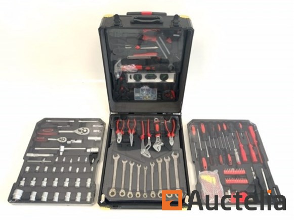 Aluminium: ja; met inhoud: ja; afmeting L: 210 mm; afmeting B: 370 mm; afmeting H: 520 mm; omschrijving: 186 delig; w.o. steek- ringsleutel met ratel; diverse tangen; doppenset met ratel; diverse schroevendraaiers; precisieschroevendraaiers; inbussleutel; diverse bits; klauwhamer; krimptang; schaar; rolmaat; waterpas; hetelijmpistool; kunststof klemmen; tapijtmes;