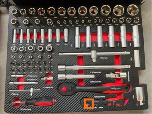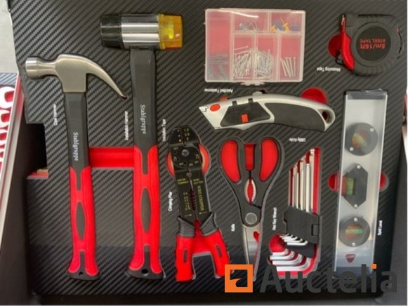 Aluminium: ja; met inhoud: ja; omschrijving: 238 delig; w.o. steek- ringsleutel met ratel; diverse tangen; doppenset met ratel; diverse schroevendraaiers; precisieschroevendraaiers; inbussleutel; diverse bits; klauwhamer; schaar; rolmaat; waterpas; tapijtmes;