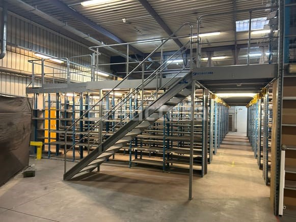 Schäfer SSI planken - R 4000 Schäfer metaal met trap aan de leuning inbegrepen Hoeveelheid: +- 9 Afmetingen voor elke plank: Lengte: 9 m Hoogte: 2,4 m Breedte: 80 cm Op de planken rust een entresol en trap met een vloerlengte van 3,80 m en een breedte van 1 m