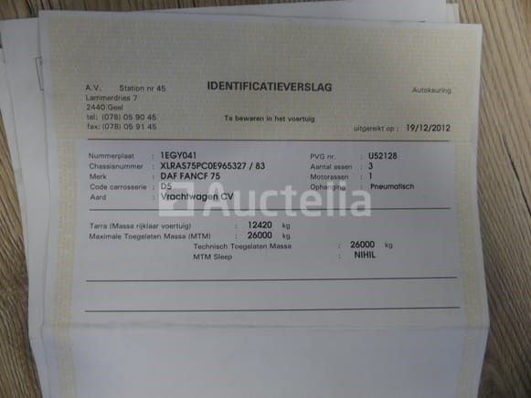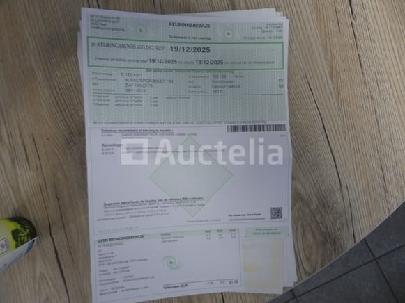 Containervrachtwagen Merk: DAF Model: FAN CF75 Jaar: 2012 Kilometerstand: 831624 Vermogen: 183 kW Datum van eerste inschrijving: 29-11-12 Brandstof: Diesel Verplaatsing (cm³): 9486 Versnellingsbak: Automatisch MMA: 26.000 kg Eigengewicht: 12420 kg Ophanging: Pneumatisch Radio: Ja Aantal toetsen: 1 Aantal zetels: 2 Certificaat van conformiteit: Ja Technisch keuringscertificaat: Ja Technisch keuringscertificaat geldig tot: 19-12-25 Registratiecertificaat Deel 1: Ja Registratiebewijs Deel 2: Ja Vrachtwagengegevens: Ja Identificatierapport: Ja Voertuig nog in gebruik (kilometerstand verandert): Nee Chassisnummer: XLRAS75PC0E965327 Eurostandaard: 5 Intern verkopersnummer (Ref): 7629 Staat: te worden opgeknapt Niet inbegrepen: Container Aanwezigheid van deuken, krassen en oxidatie door standaard slijtage Ik begon met booster bij het inventariseren Geleverd zonder kenteken en zonder container Opmerkingen: Het voertuig is tijdens de inventarisatie niet grondig geïnspecteerd en kan niet-zichtbare gebreken vertonen De koper zou het perceel vóór de veiling hebben bezocht om de afhandeling en logistiek te plannen die nodig zijn voor het innen van zijn aankoop