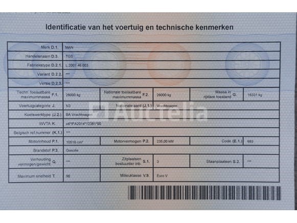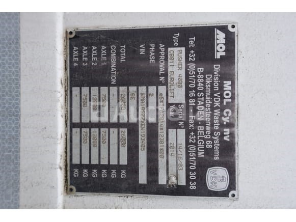 Vuilniswagen Merk: MAN Model: TGS Jaar: 2014 Kilometerstand: 311283 Vermogen: 235 kW Datum van eerste inschrijving: 25-04-14 Brandstof: Diesel Verplaatsing (cc³): 10518 Versnellingsbak: Automatisch MMA: 26.000 kg Tare: 16.331 kg Ophanging: Pneumatisch Radio: Ja Achteruitrijcamera: Ja Aantal toetsen: 1 Aantal zetels: 2 Certificaat van conformiteit: Ja Technisch keuringscertificaat: Ja Technisch inspectiecertificaat geldig tot: 21-05-26 Registratiecertificaat Deel 1: Ja Registratiebewijs Deel 2: Ja Vrachtwagengegevensblad: Nee Identificatierapport: Ja Voertuig nog in gebruik (kilometerstand verandert): Nee Chassisnummer: WMA18SZZXEW193405 Eurostandaard: 5 Intern verkopersnummer (Ref): 1241 Getest: Nee