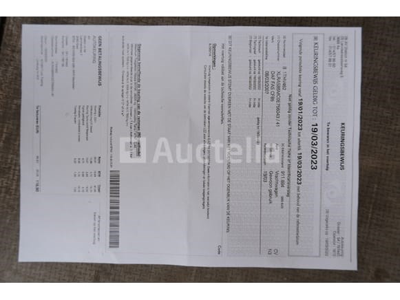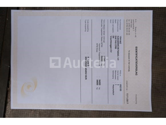 Containervrachtwagen Merk: DAF Model: FAS CF85 Jaar: 2007 Kilometerstand: 927937 Vermogen: 265 kW Datum van eerste inschrijving: 08-03-07 Brandstof: Diesel Verplaatsing (cc): 12902 Versnellingsbak: Automatisch MMA: 26.000 kg Tare: 11365 kg Ophanging: Pneumatisch Radio: Ja Achteruitrijcamera: Ja Aantal toetsen: 1 Aantal zetels: 2 Certificaat van conformiteit: Ja Certificaat van inspectie bij de technische inspectie: Te controleren Technisch inspectiecertificaat geldig tot: 19-03-23 Registratiecertificaat Deel 1: Ja Registratiebewijs Deel 2: Ja Vrachtwagengegevens: Ja Identificatierapport: Ja Voertuig nog in gebruik (kilometerstand verandert): Nee Chassisnummer: XLRAS85MC0E756043 Eurostandaard: 5 Intern verkopersnummer (Ref): 6093 Getest: Nee Staat: te worden opgeknapt Aanwezigheid van deuken, krassen en oxidatie door standaard slijtage en schade aan de carrosserie Ik begon met booster bij het inventariseren Geleverd zonder kenteken Opmerkingen: Het voertuig is tijdens de inventarisatie niet grondig geïnspecteerd en kan niet-zichtbare gebreken vertonen De koper zou het perceel vóór de veiling hebben bezocht om de afhandeling en logistiek te plannen die nodig zijn voor het innen van zijn aankoop