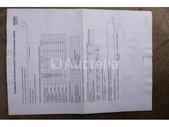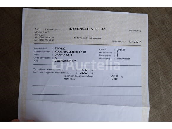 Vuilniswagen Merk: DAF Model: FAN CF75 Jaar: 2009 Vermogen: 183 kW Datum van 1e inschrijving: 10-04-09 Brandstof: Diesel Verplaatsing (cc): 9186 Versnellingsbak: Automatisch MMA: 26.000 kg Tare: 14.780 kg Ophanging: Pneumatisch Radio: Ja Achteruitrijcamera: Ja Aantal toetsen: 1 Aantal zetels: 3 Certificaat van conformiteit: Ja Technisch keuringscertificaat: Ja Technisch keuringscertificaat geldig tot: 27-05-26 Registratiecertificaat Deel 1: Ja Registratiebewijs Deel 2: Ja Vrachtwagengegevens: Ja Identificatierapport: Ja Voertuig nog in gebruik (kilometerstand verandert): Nee Chassisnummer: XLRAS75PC0E855168 Eurostandaard: 5 Intern verkopersnummer (Ref): 6745 Getest: Nee Staat: te worden opgeknapt Geleverd zonder motor (uit elkaar gehaald) Laatst bekende kilometerstand op CT van 16/05/2025: 447066 km Aanwezigheid van deuken, krassen en oxidatie door standaard slijtage Geleverd zonder kenteken Opmerkingen: Het voertuig is tijdens de inventarisatie niet grondig geïnspecteerd en kan niet-zichtbare gebreken vertonen De koper zou het perceel vóór de veiling hebben bezocht om de afhandeling en logistiek te plannen die nodig zijn voor het innen van zijn aankoop