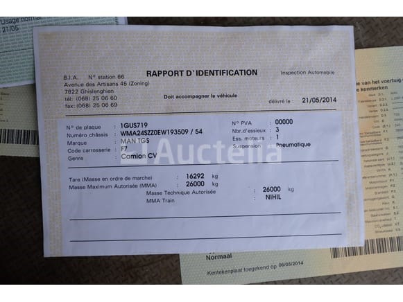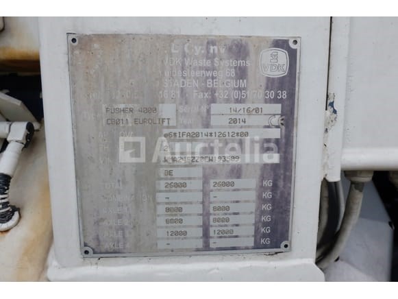 Vuilniswagen Merk: MAN Model: TGS Jaar: 2014 Kilometerstand: 374608 Vermogen: 235 kW Datum van eerste inschrijving: 06-05-14 Brandstof: Diesel Verplaatsing (cc³): 10518 Versnellingsbak: Automatisch MMA: 26.000 kg Tare: 16.292 kg Ophanging: Pneumatisch Airconditioning: Automatisch Radio: Ja Achteruitrijcamera: Ja Aantal toetsen: 1 Aantal zetels: 3 Certificaat van conformiteit: Ja Technisch keuringscertificaat: Ja Technisch inspectiecertificaat geldig tot: 21-05-26 Registratiecertificaat Deel 1: Ja Registratiebewijs Deel 2: Ja Vrachtwagengegevensblad: Nee Identificatierapport: Ja Voertuig nog in gebruik (kilometerstand verandert): Nee Chassisnummer: WMA24SZZ0EW193509 Eurostandaard: 5 Intern verkopersnummer (Ref): 1300 Getest: Nee Staat: te worden opgeknapt Aanwezigheid van deuken, krassen en oxidatie door standaard slijtage Begonnen tijdens de inventarisatie Geleverd zonder kenteken Opmerkingen: Het voertuig is tijdens de inventarisatie niet grondig geïnspecteerd en kan niet-zichtbare gebreken vertonen De koper zou het perceel vóór de veiling hebben bezocht om de afhandeling en logistiek te plannen die nodig zijn voor het innen van zijn aankoop