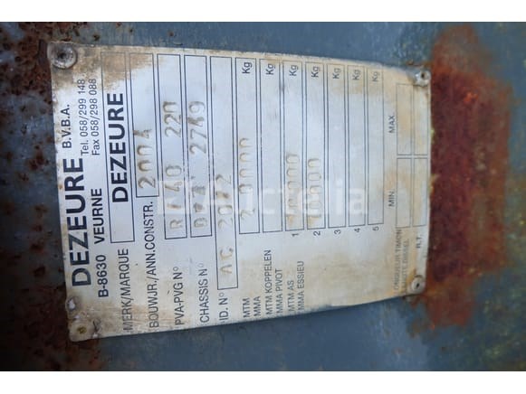 Containertrailer (voor onderdelen) Merk: Dezeure Model: AC2012 Jaar: 2004 Openingstijden: 6089 Datum van eerste inschrijving: 09-02-04 MMA: 20.000 kg Conformiteitscertificaat: Nee Inspectiecertificaat bij de technische inspectie: Nee Registratiecertificaat Deel 1: Nee Registratiecertificaat Deel 2: Nee Chassisnummer: DEZ2749 Intern verkopersnummer (Ref): 1267 Conditie: Voor onderdelen Afmetingen en algemene staat zijn tijdens het bezoek ter plaatse te zien Bezoek wordt sterk aanbevolen Opmerkingen: Het voertuig is tijdens de inventarisatie niet grondig geïnspecteerd en kan niet-zichtbare gebreken vertonen De koper zou het perceel vóór de veiling hebben bezocht om de afhandeling en logistiek te plannen die nodig zijn voor het innen van zijn aankoop