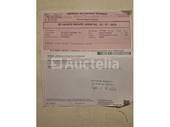 Auto Merk: Peugeot Model: 307 Stationwagen Jaar: 2007 Kilometerstand: 115438 Vermogen: 66 kW Datum van eerste inschrijving: 07-08-07 Brandstof: Diesel Verplaatsing (cm³): 1560 Versnellingsbak: Handgeschakeld Airconditioning: Automatisch Radio: Ja Aantal toetsen: 2 Aantal zetels: 5 Certificaat van conformiteit: Ja Technisch keuringscertificaat: Ja Technisch keuringscertificaat geldig tot: 22-07-23 Registratiecertificaat Deel 1: Ja Registratiecertificaat Deel 2: geen Voertuig nog in gebruik (kilometerstand verandert): Nee Chassisnummer: VF33E9HXC85068911 Eurostandaard: 4 Conditie: Niet getest Lege batterij, breng booster Voertuig rijden op het moment van ophalen Aanwezigheid van slagen, krassen en oxidatie door normale slijtage Rood technisch keuringscertificaat (stuurkogelgewricht te vervangen) Geleverd met 4 winterbanden (tweedehands) Geleverd zonder kenteken Aanbevolen bezoek Opmerkingen: Het voertuig is tijdens de inventarisatie niet grondig geïnspecteerd en kan niet-zichtbare gebreken vertonen De koper zou het perceel vóór zijn veiling hebben bezocht om de logistiek en afhandeling te plannen die nodig zijn voor het innen van zijn aankoop
