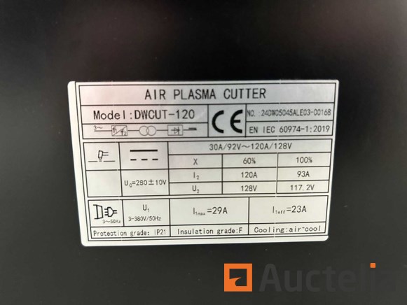 Rated power: 19 kVA; Rated current: 29 A; No-load voltage: 280 V; Output current adjustment: 30-120 A; Rated output voltage: 128 V; Max cutting thickness: 45 mm; Cyclic duration factor: 60%; Efficiency: 80%; Insulation grade: F; Protection grade: IP21; Arc-start: Contact