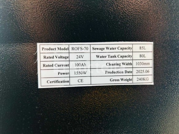 Disk brush 520mm; scrubbing width 850mm; clear watertank 80L; Recovery 85L; disk brush speed 150 RPM; Disk brush pressure 65KG; work capacity 2500m/h; Voltage 24V; Battery 100Ah*2*12V; Vacuum motor 550W; Disk brish motor 550W; batterij monitor; light; speed regulator; horn; Charger; manual; 7536