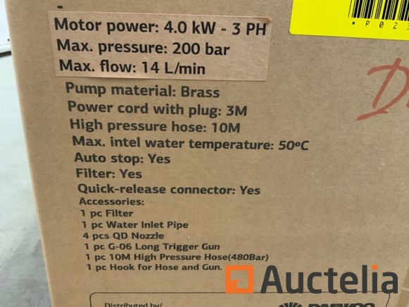 380V Motor: 4000W Max. Flow: 14L/min Max. pressure: 200 Bar Max. intel water temp: 50 graden Stroomkabellengte: 3M Autostop Filter Hogedrukslang 10M Spuitkop