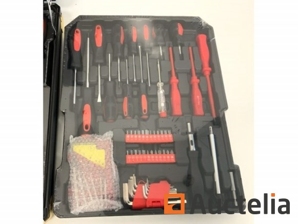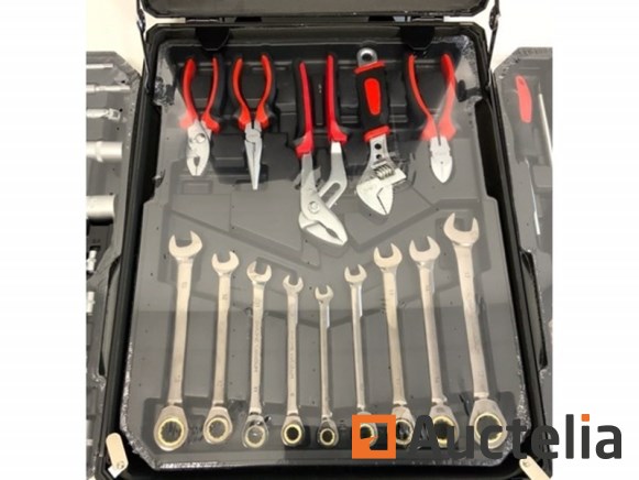 Aluminium: ja; met inhoud: ja; afmeting L: 210 mm; afmeting B: 370 mm; afmeting H: 520 mm; omschrijving: 186 delig; w.o. steek- ringsleutel met ratel; diverse tangen; doppenset met ratel; diverse schroevendraaiers; precisieschroevendraaiers; inbussleutel; diverse bits; klauwhamer; krimptang; schaar; rolmaat; waterpas; hetelijmpistool; kunststof klemmen; tapijtmes;