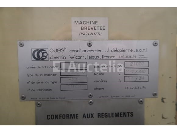 Industriële verpakkingsmachine Merk: Ouest Emballage Model: FA650C18 Jaar: 1987 Spanning: 400V driefasig Lengte: 380 cm Breedte: 120 cm Hoogte: 195 cm Vermogen: 21 kW Conditie: Niet getest Aanbevolen bezoek