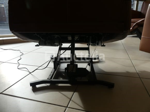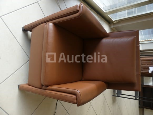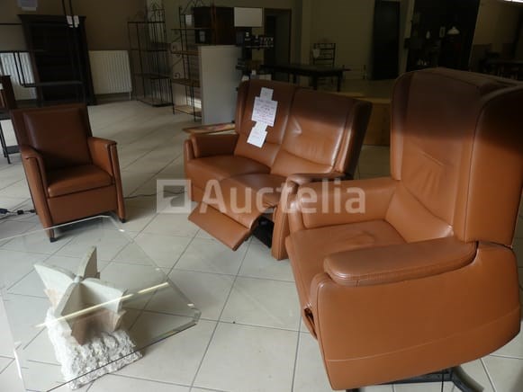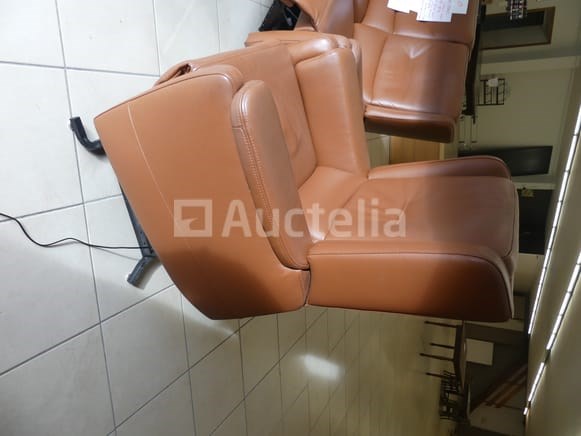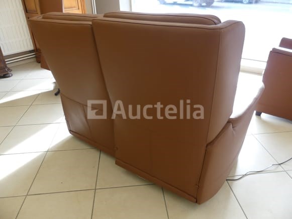 Compositie: 1 2-persoons bank met elektrische relaxstoel Afmetingen: 150x80x107 cm 1 elektrische relaxstoel met lift Afmetingen: 83x80x107 cm 1 leren fauteuil van koehuid Afmetingen: 65x65x30 cm 1 tafel met glazen plank Afmetingen: 125x60 cm